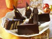 Als zweite Schicht 1-2 Eßlöffel Teig auf die gebackene Schicht streichen, die Form wieder unter den Grill schieben. Auf diese Weise die Hälfte des Teiges (etwa 6 Schichten) verarbeiten. Das fertige Geback vorsichtig aus der Form lösen und auf einen Kuchenrost stürzen und das Papier abziehen. Den restlichen Teig in gleicher Weise backen. Die beiden Gebäckstücke erkalten lassen, jeweils der Länge nach halbieren, so daß vier Stangen entstehen. Diese dann so schneiden, daß Dreiecke entstehen.