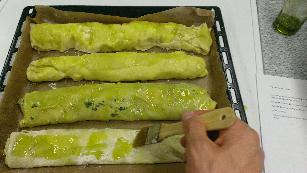 Mit einem Pinsel einölen, dafür kann das Öl in der Schüssel verwendet werden.