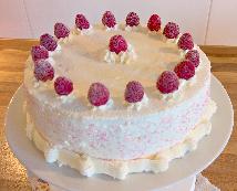Gut die Hälfte der Joghurtcreme auf den Biskuitboden streichen und 2/3 des Himbeerpürees darauf verteilen. Darauf restliche Joghurtcreme und nochmals restliche Himbeeren geben. Creme, wie bei einem Marmorkuchen, mit einer Gabel durchziehen. Zweiten Boden darauflegen und gut andrücken. Torte ca. 4 Stunden kühl stellen.